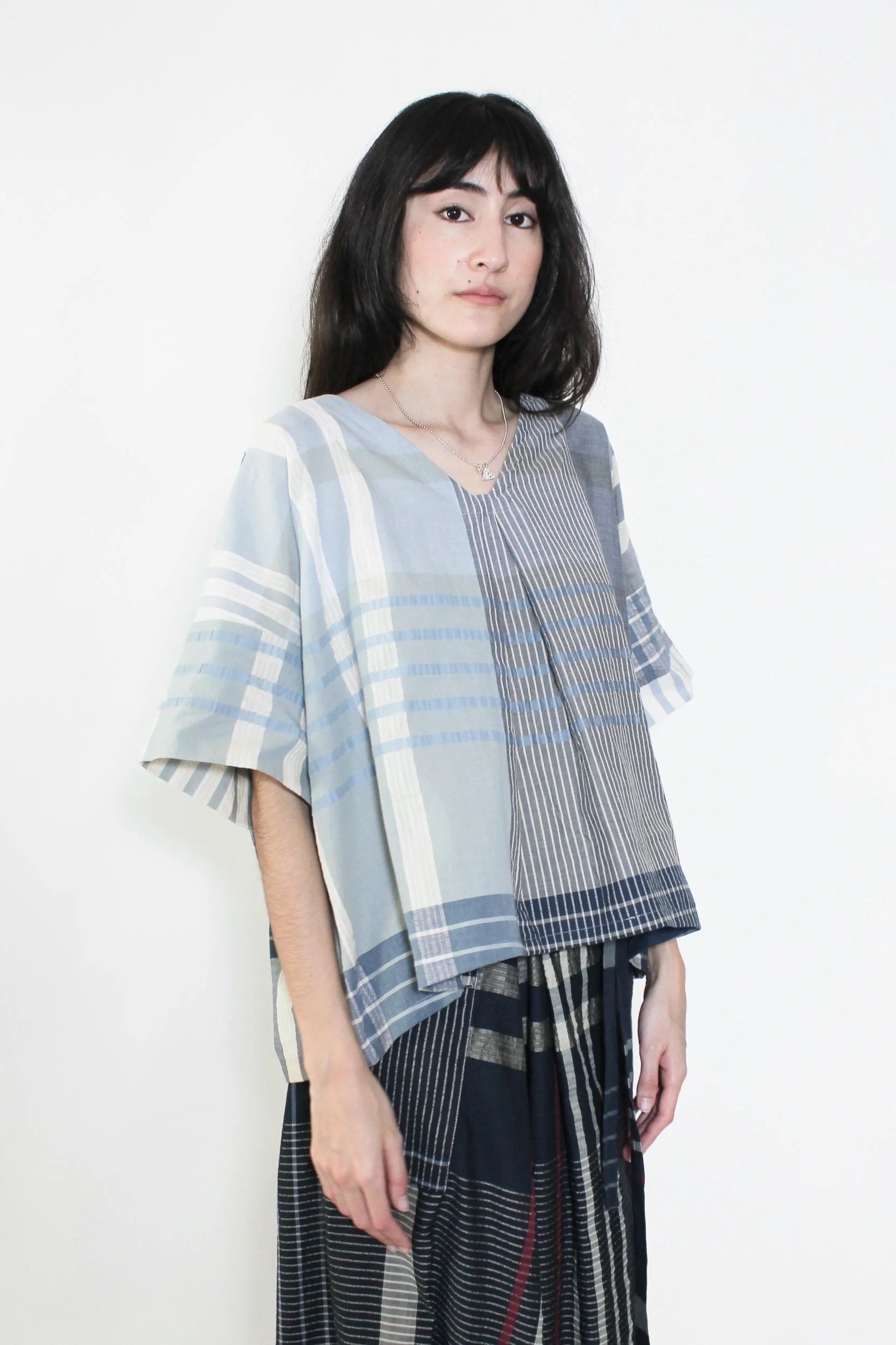 As with each piece in the collection, this top moves away from traditional Western patternmaking techniques. It features flat, geometric panels and is reversible; either the boatneck or V-neck can be worn at the front. Fabric pattern placement will vary with each piece made so no two are exactly the same.